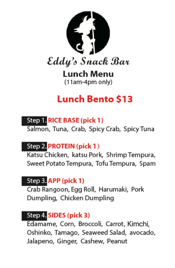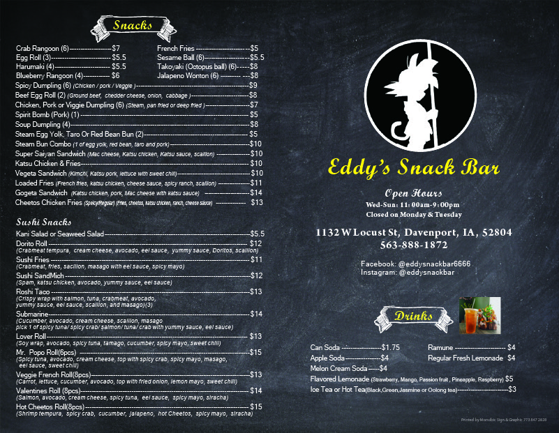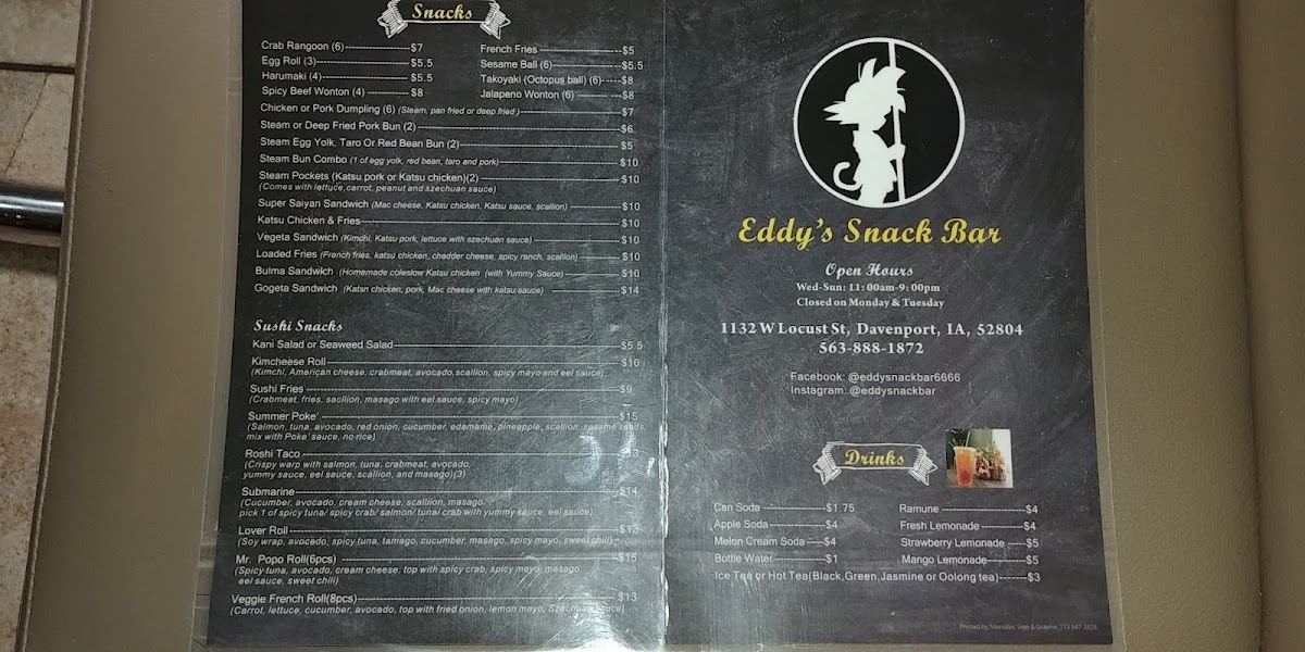 Welcome to Eddy's Snack Bar, a hidden gem located at 1132 W Locust St, Davenport, IA. This vibrant eatery features an enticing blend of Asian-inspired dishes and delectable desserts, perfect for satisfying any craving. The standout item on the menu is the Build Your Own option at just $15, allowing diners to craft their perfect meal.